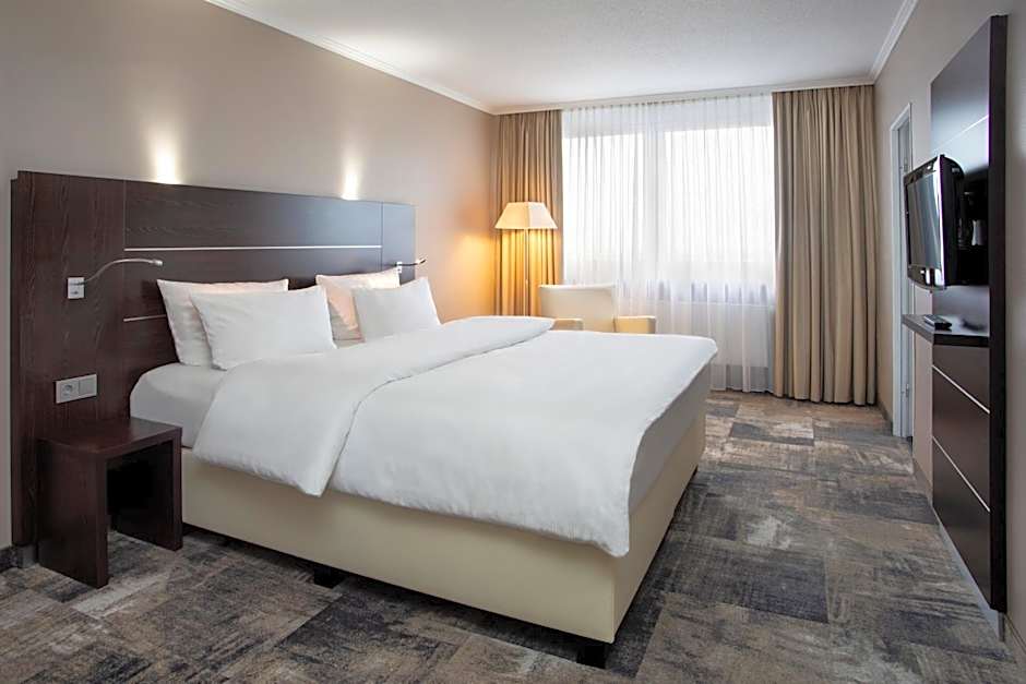 Large contemporary-style room with a cable TV, work desk and private bathroom with hairdryer.